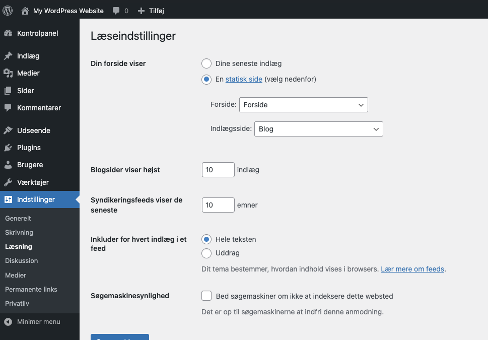 I kontrolpanelet skal du gå ind i læsning og tilføje forsiden og blogsiden til disse sider, fx sådan: