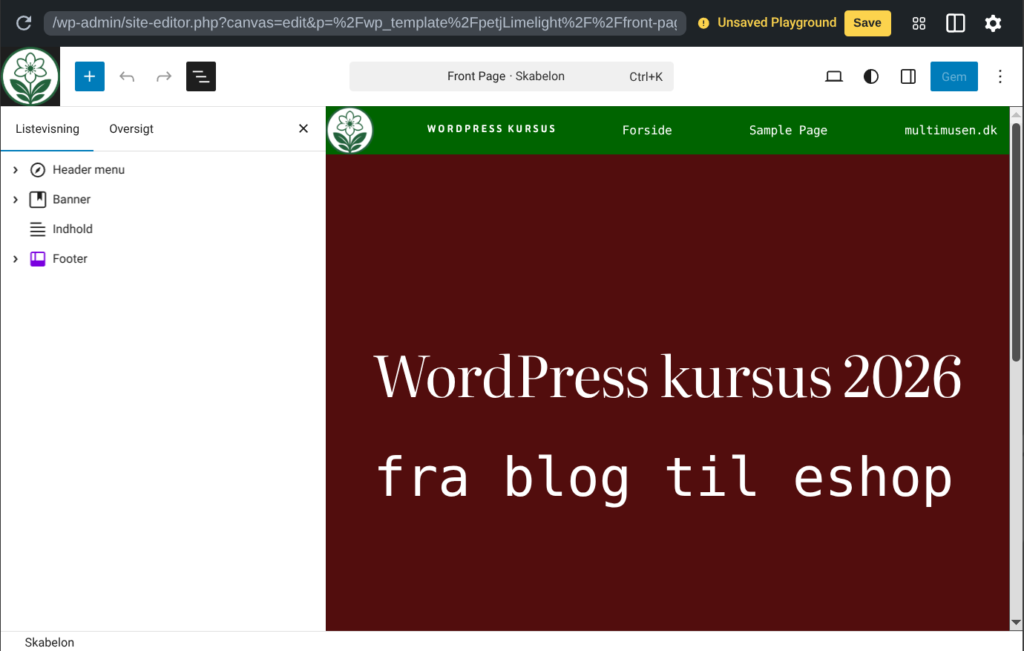 Så nu kan du designe din forside, som du vil. Hvad du gør i denne skabelon bliver simpelt hen til din forside!