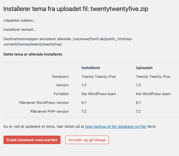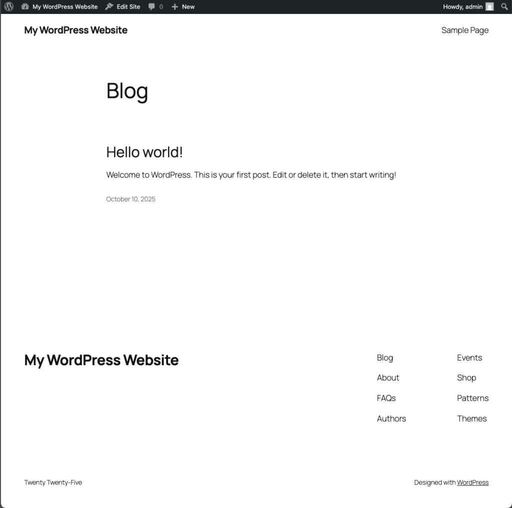 Resultatet ser du her – en rimeligt blank version af WP-standardtemaet (her Twenty Twenty-five).