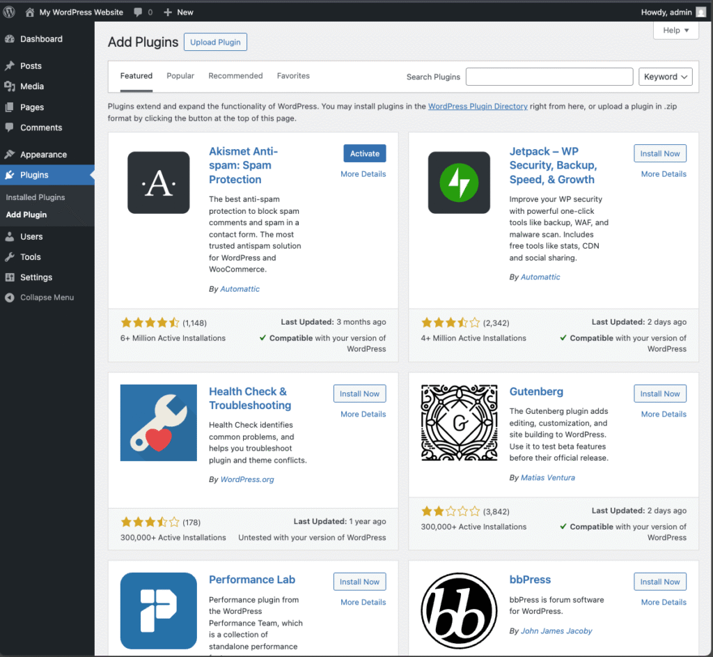 Når du logger ind kan du installere og afprøve plugins fra kontrolpanelet.